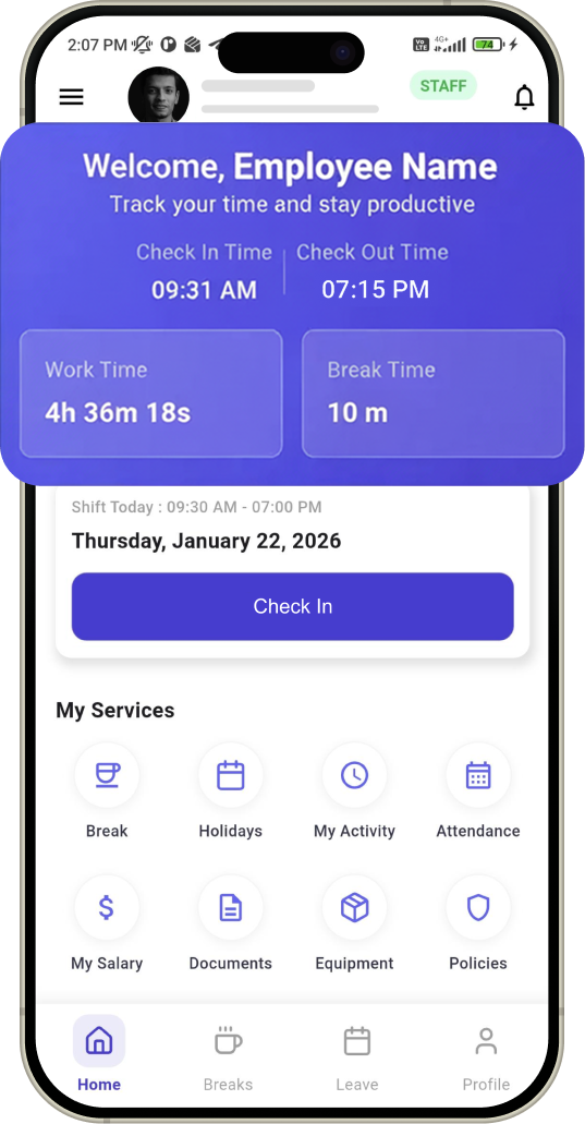 Manage attendance, leaves, payroll, and tasks — all from a single mobile app. Stay connected and productive wherever you go.