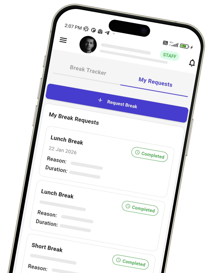 Clock in with a single tap. Track shifts, breaks, and work hours with GPS accuracy and real-time sync across web and mobile.